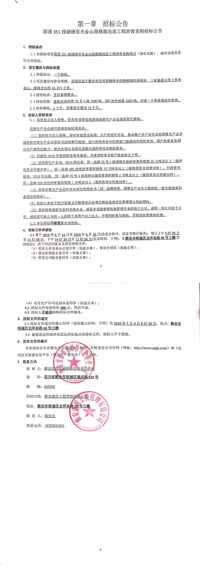 威廉希尔集团路桥有限责任公司国道351线硗碛至夹金山段路面改造工程沥青采购招标公告