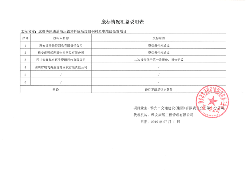 雅安市交通建设(集团)有限责任公司第一分公司成雅快速通道高压铁塔拆除后废旧钢材及电缆线处置项目废标情况汇总说明表