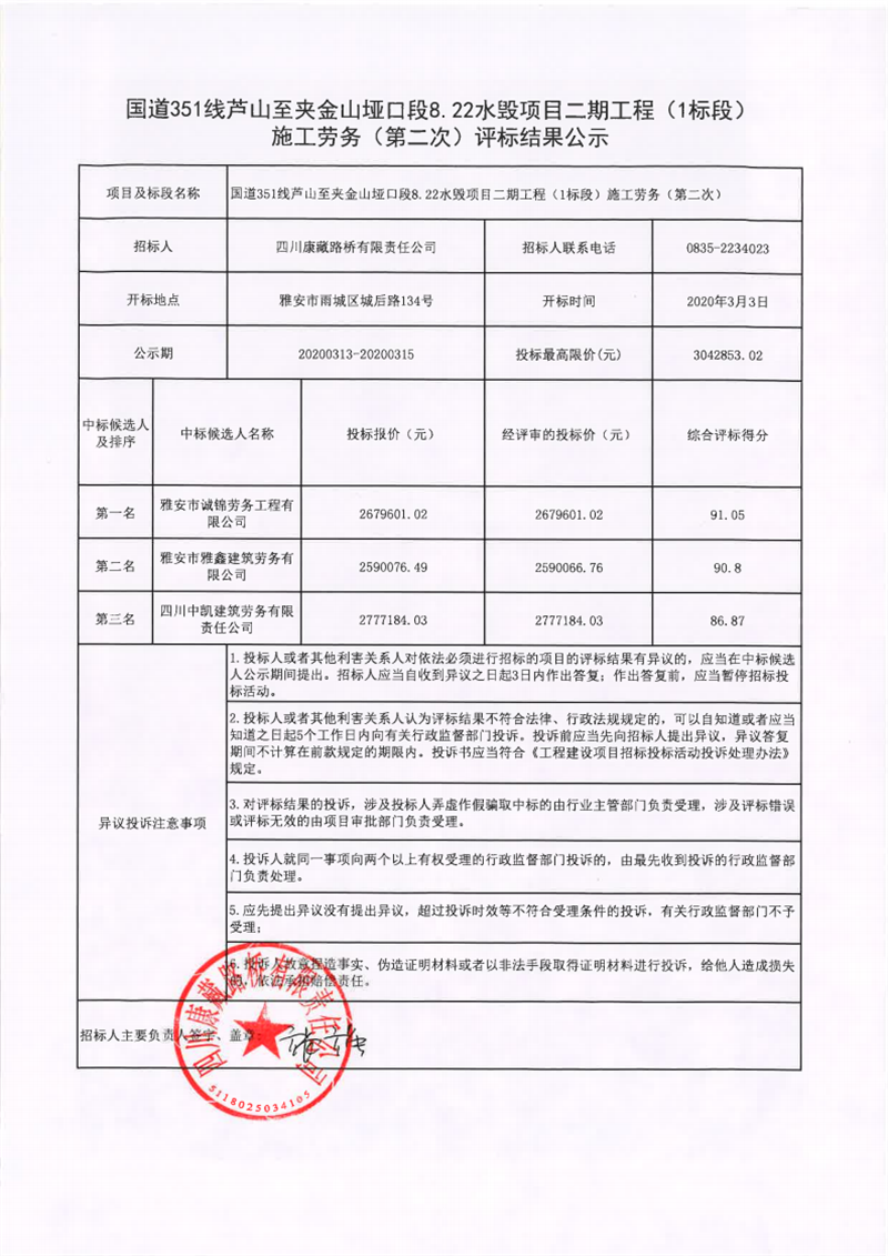 四川康藏路桥有限责任公司国道351线芦山至夹金山垭口段8.22水毁项目二期工程(1标段)施工劳务(第二次)评标结果公示