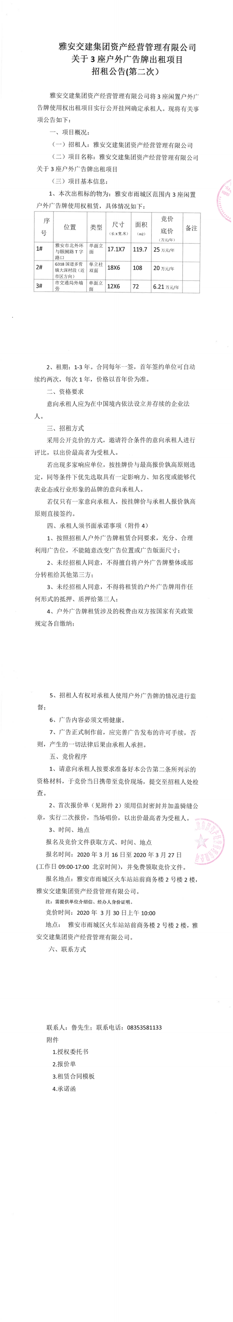 威廉希尔集团资产经营管理有限公司关于3座户外广告牌出租项目招租公告(第二次)