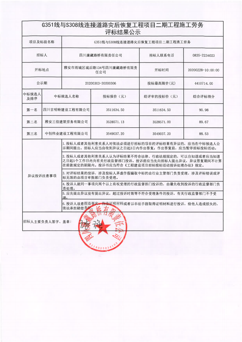 四川康藏路桥有限责任公司G351线与S308线连接道路灾后恢复工程项目二期工程施工劳务评标结果公示