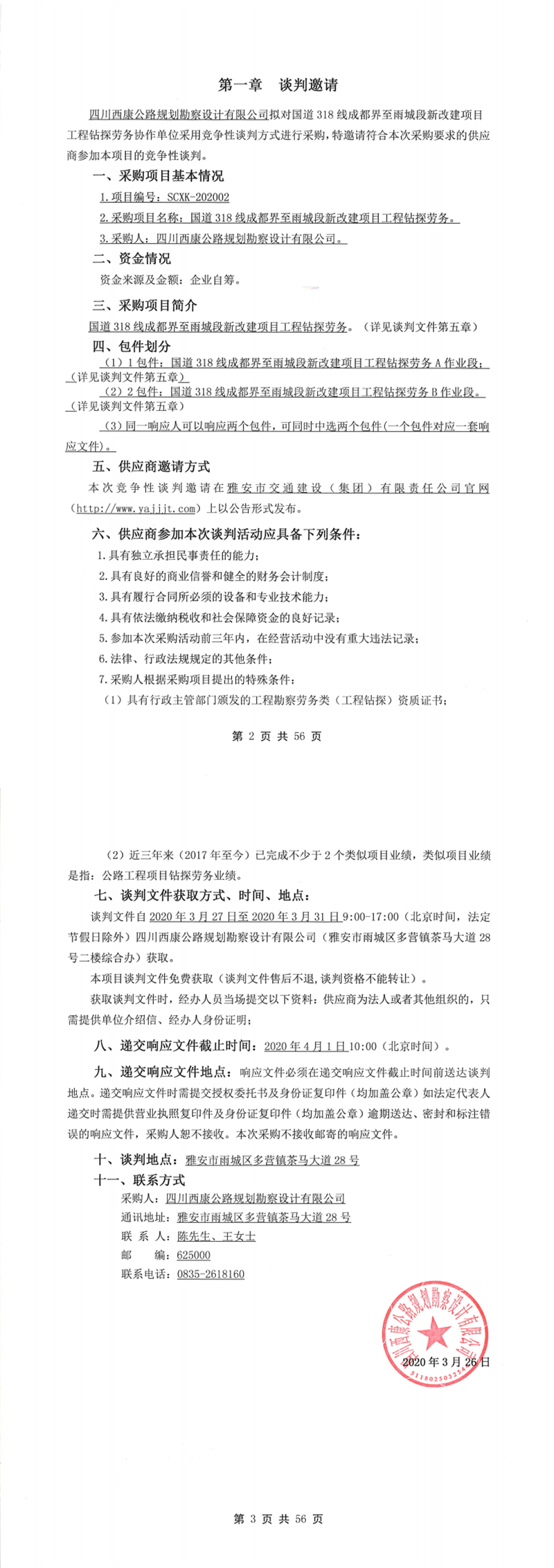 四川西康公路规划勘察设计有限公司国道318线成都界至雨城段新改建项目工程钻探劳务竞争性谈判公告