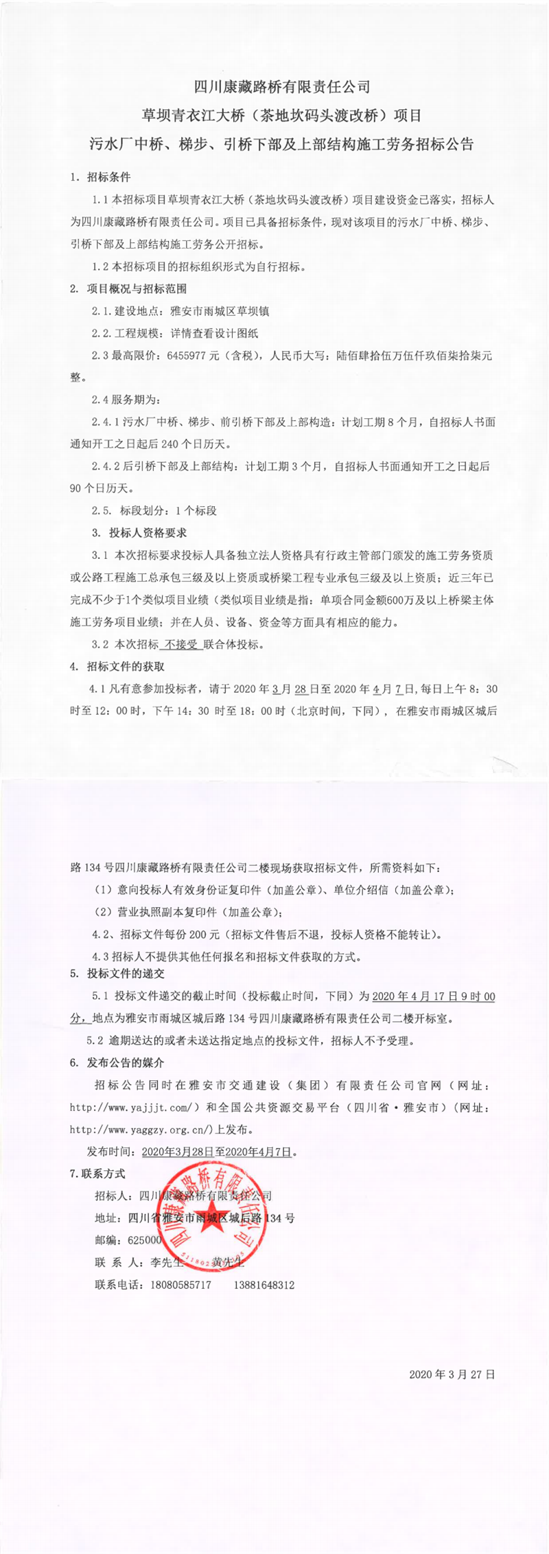 四川康藏路桥有限责任公司草坝青衣江大桥(茶地坎码头渡改桥)项目主桥墩柱及上部结构施工劳务招标公告