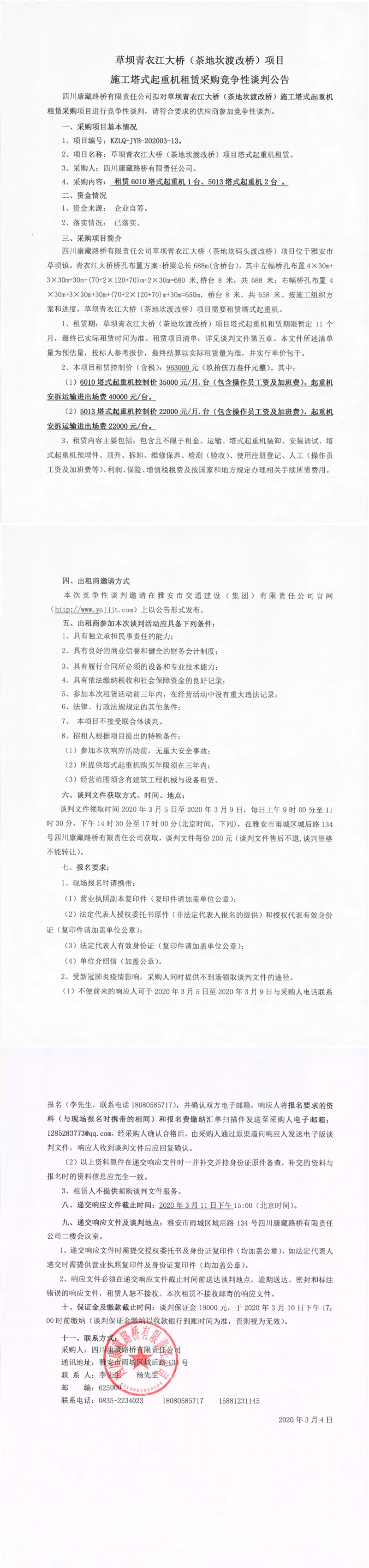 四川康藏路桥有限责任公司草坝青衣江大桥(茶地坎渡改桥)项目塔式起重机租赁采购竞争性谈判结果公示