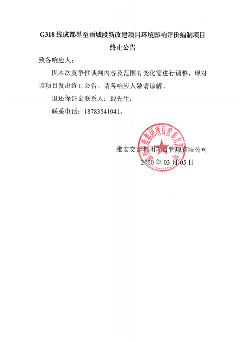 威廉希尔集团项目管理有限公司G318线成都界至雨城段新改建项目环境影响评价编制项目终止公告