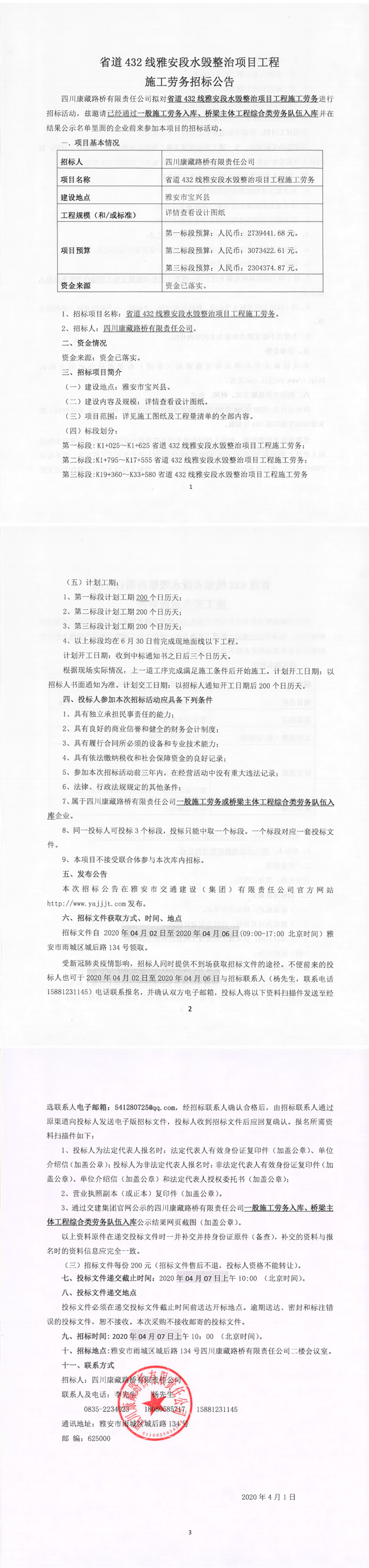 四川康藏路桥有限责任公司省道432线雅安段水毁整治项目工程施工劳务招标公告