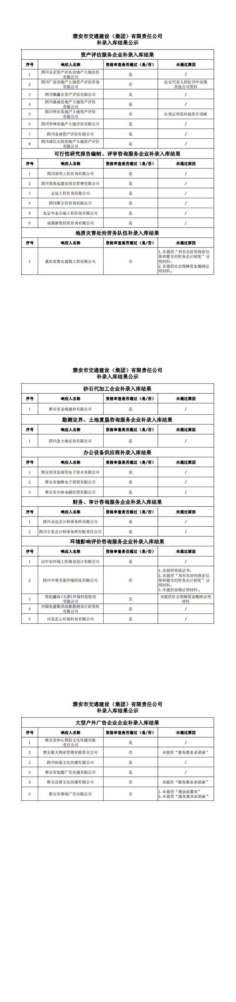 雅安市交通建设(集团)有限责任公司补录入库结果公示