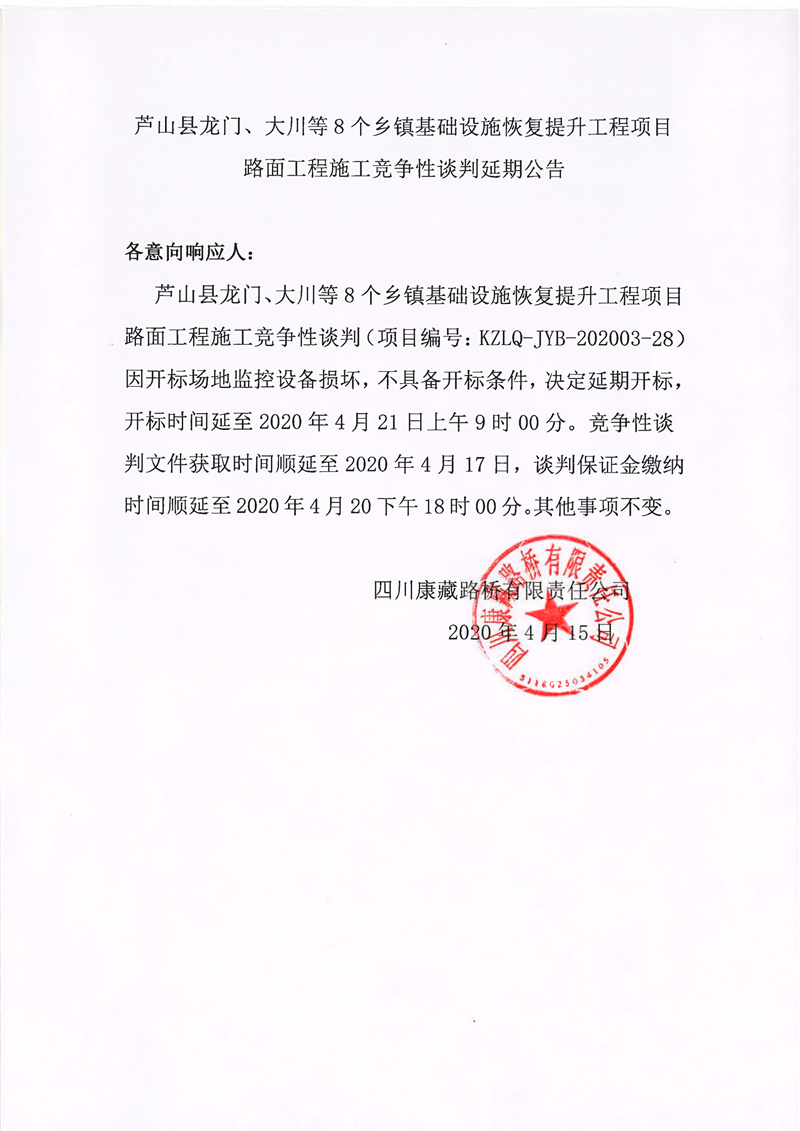 四川康藏路桥有限责任公司芦山县龙门、大川等8个乡镇基础设施恢复提升工程项目路面工程施工竞争性谈判延期公告