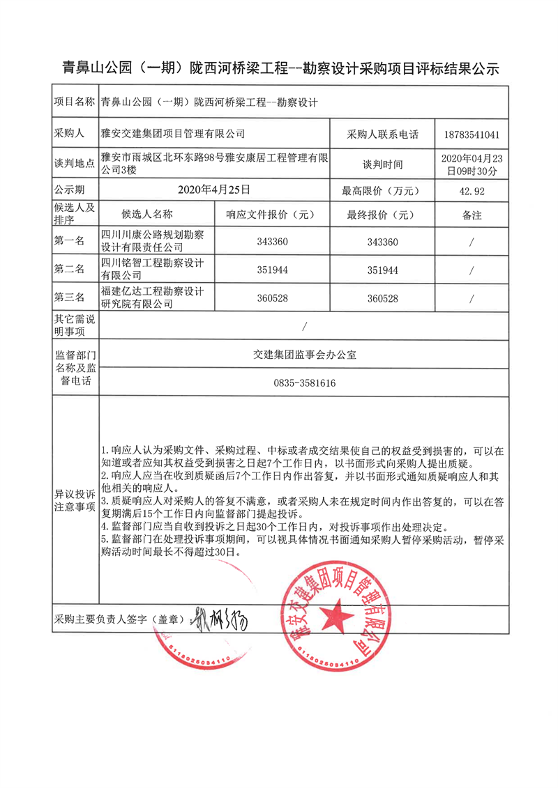 威廉希尔集团项目管理有限公司青鼻山公园(一期)陇西河桥梁工程项目勘察设计采购项目评标结果公示