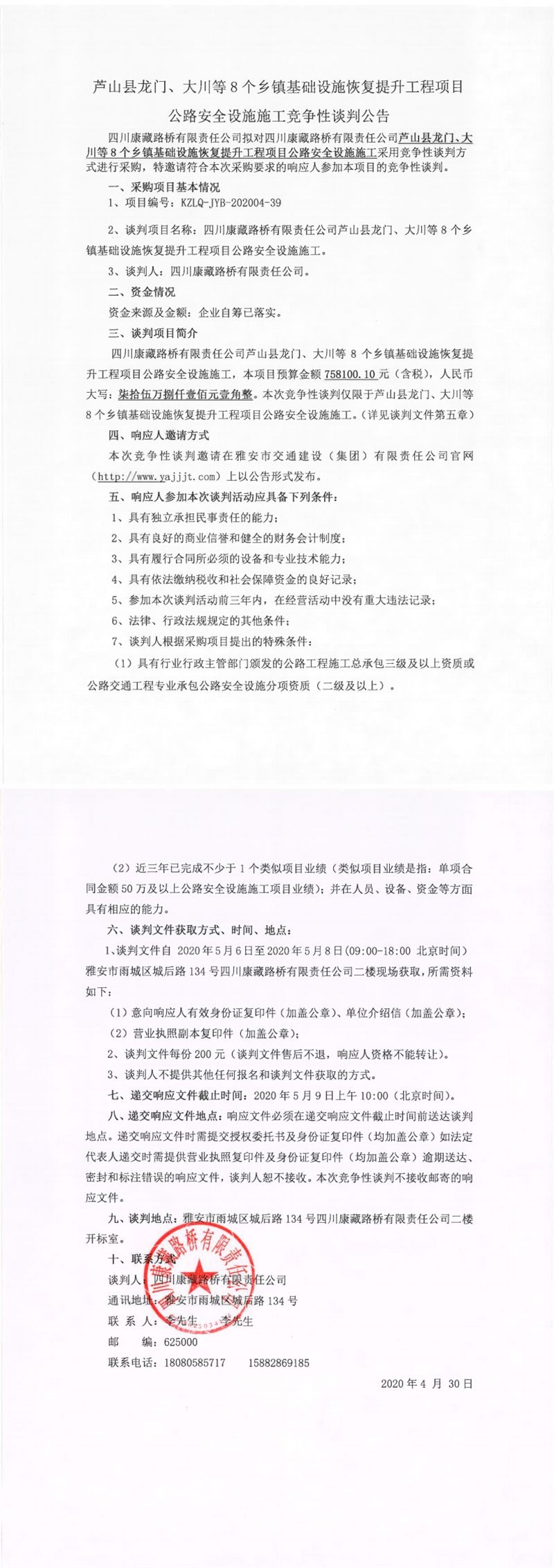 四川康藏路桥有限责任公司芦山县龙门、大川等8个乡镇基础设施恢复提升工程项目公路安全设施施工竞争性谈判公告