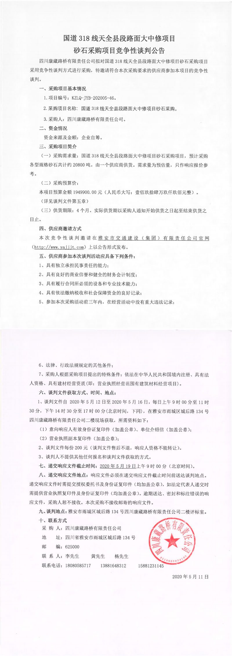 四川康藏路桥有限责任公司国道318线天全县段路面大中修项目砂石采购项目竞争性谈判公告