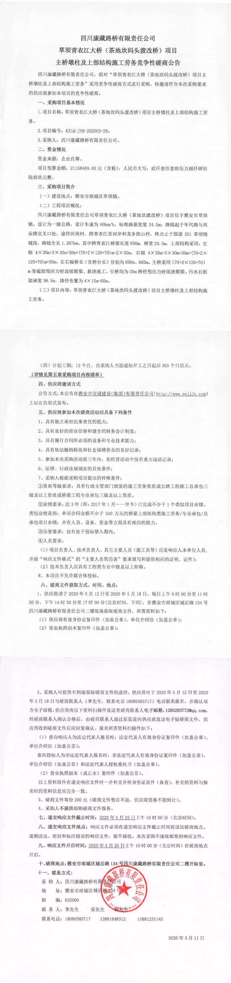 四川康藏路桥有限责任公司草坝青衣江大桥(茶地坎码头渡改桥)项目主桥墩柱及上部结构施工劳务竞争性磋商公告