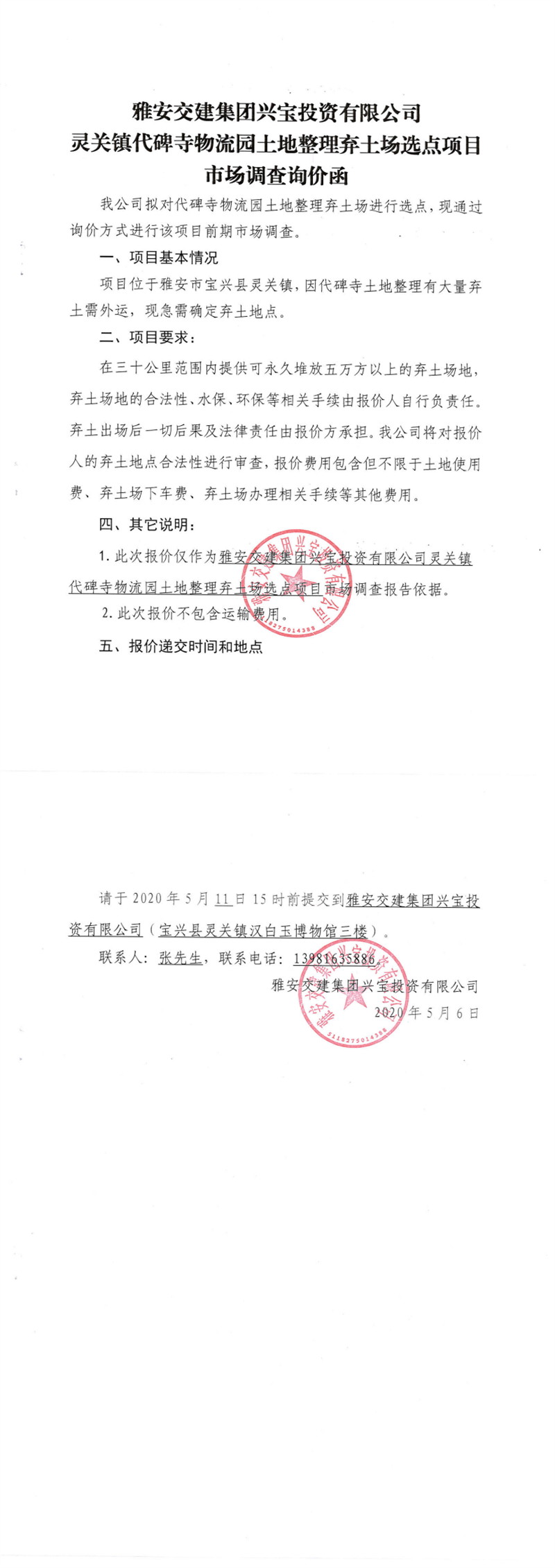 威廉希尔集团兴宝投资有限公司灵关镇代碑寺物流园土地整理弃土场选点项目市场调查询价函