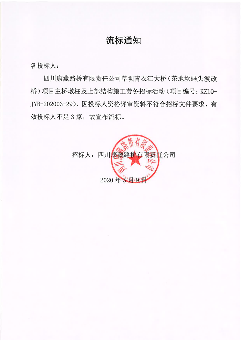四川康藏路桥有限责任公司草坝青衣江大桥(茶地坎码头渡改桥)项目主桥墩柱及上部结构施工劳务流标通知