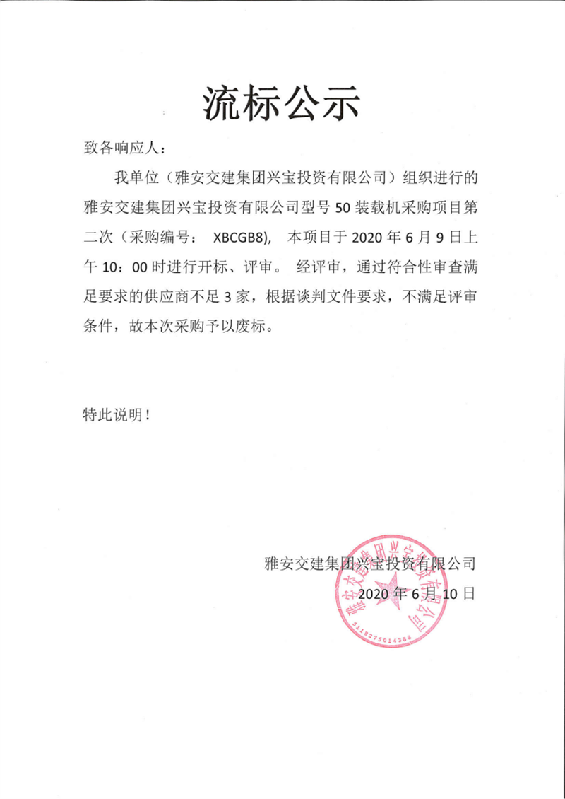 威廉希尔集团兴宝投资有限公司型号50装载机采购项目第二次流标公示