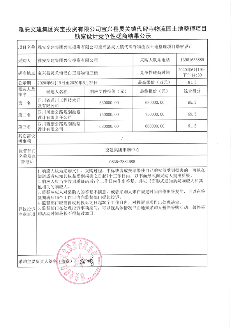 威廉希尔集团兴宝投资有限公司宝兴县灵关镇代碑寺物流园土地整理项目勘察设计竞争性磋商结果公示