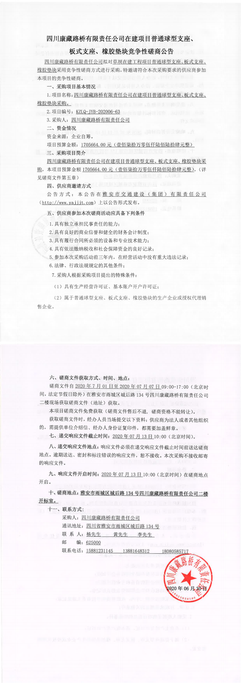 四川康藏路桥有限责任公司在建项目普通球型支座、板式支座、橡胶垫块采购竞争性磋商公告