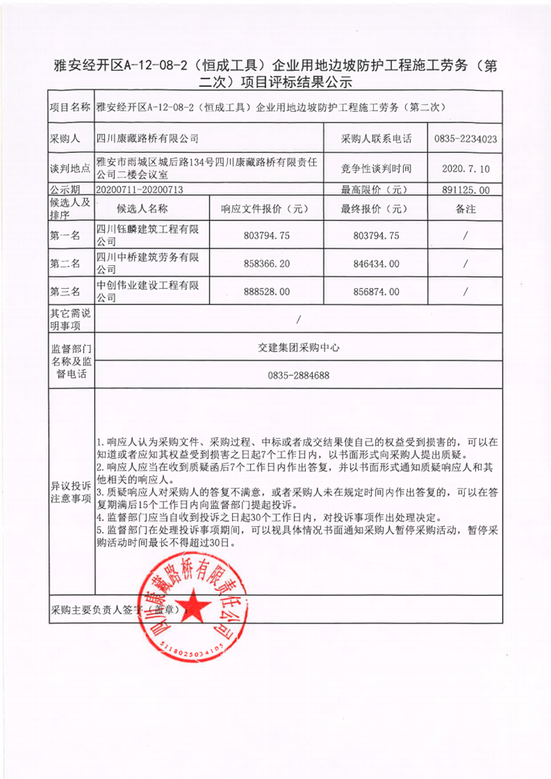 四川康藏路桥有限公司雅安经开区A-12-08-2(恒成工具)企业用地边坡防护工程施工劳务(第二次)项目评标结果公示