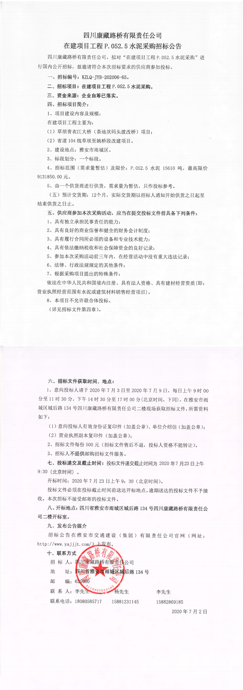 四川康藏路桥有限责任公司在建项目工程P.052.5水泥采购招标公告