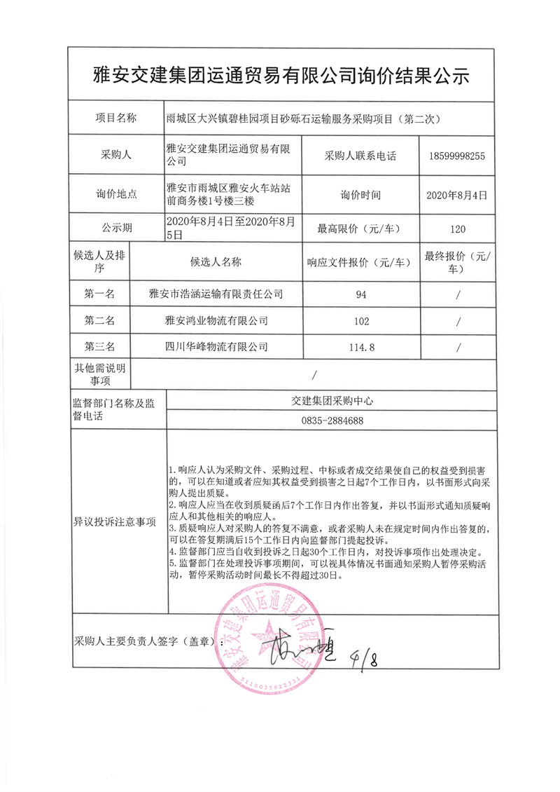 威廉希尔集团运通贸易有限公司雨城区大兴镇碧桂园项目砂砾石运输服务采购项目(第二次)询价结果公示