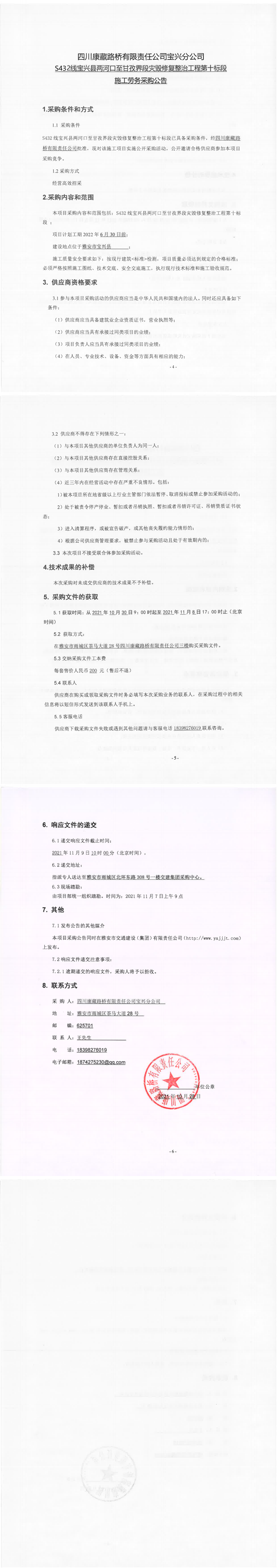 四川康藏路桥有限责任公司宝兴分公司S432线宝兴县两河口至甘孜界段灾毁修复整治工程第十标段施工劳务采购公告