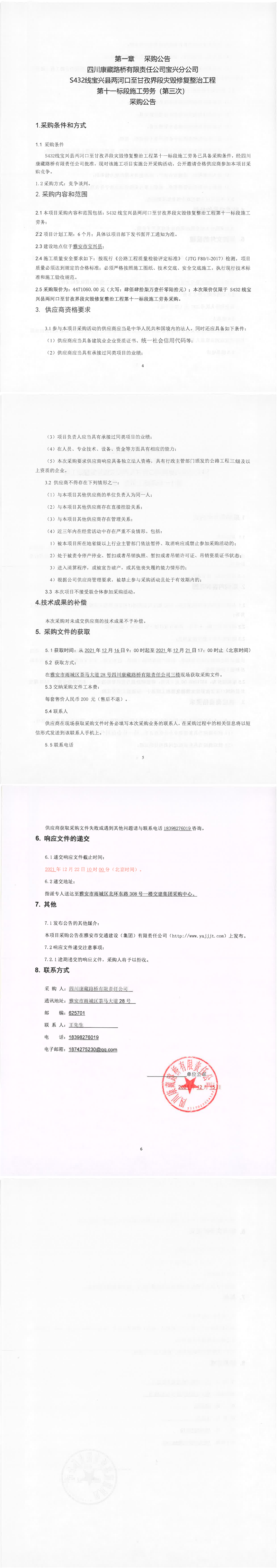 四川康藏路桥有限责任公司S432线宝兴县两河口至甘孜界段灾毁修复整治工程第十二标段施工劳务经营高效招采结果公示