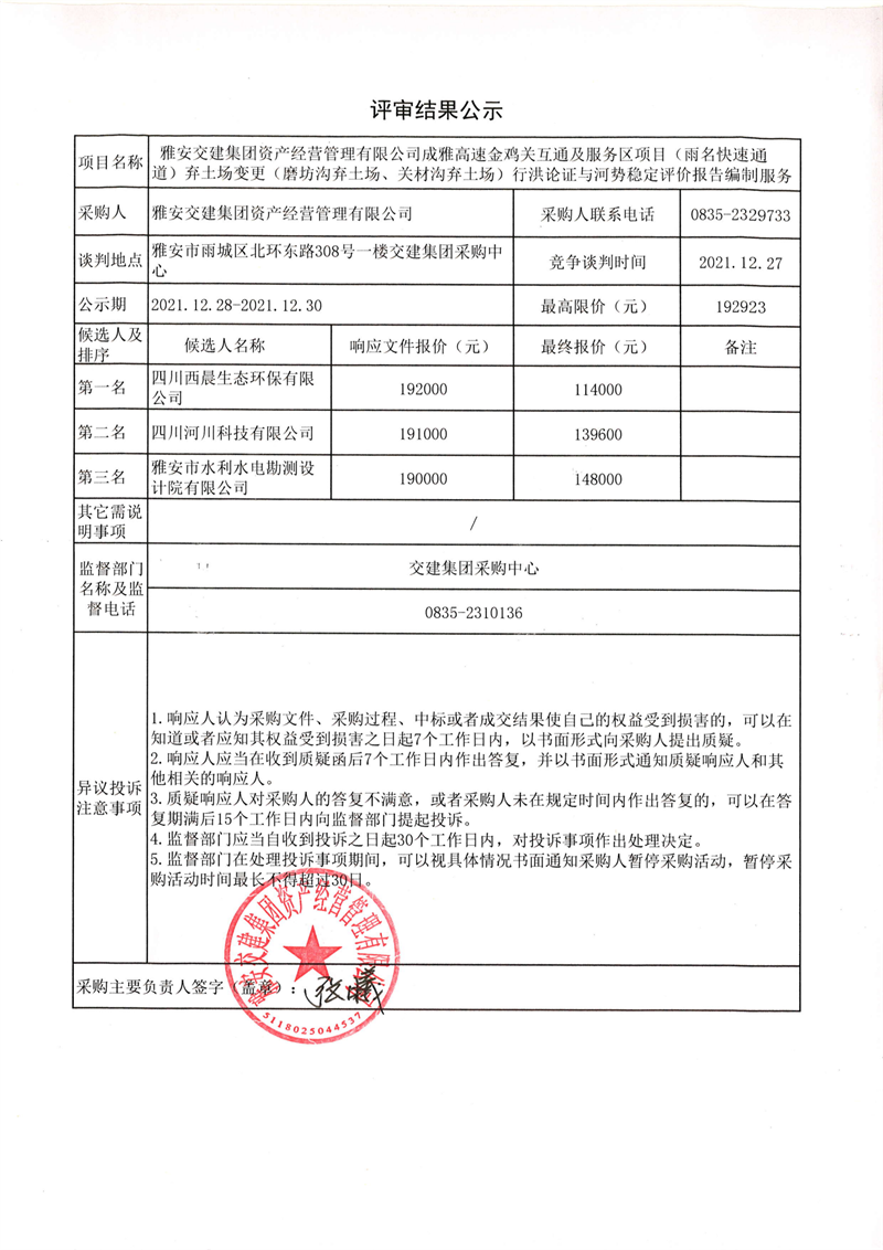 威廉希尔集团资产经营管理有限公司成雅高速金鸡关互通及服务区项目(雨名快速通道)弃土场变更(磨坊沟弃土场、关材沟弃土场)行洪论证与河势稳定评价报告编制服务评审结果公示