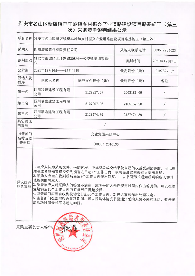 四川康藏路桥有限责任公司雅安市名山区新店镇至车岭镇乡村振兴产业道路建设项目路基施工(第三次)采购竞争谈判结果公示