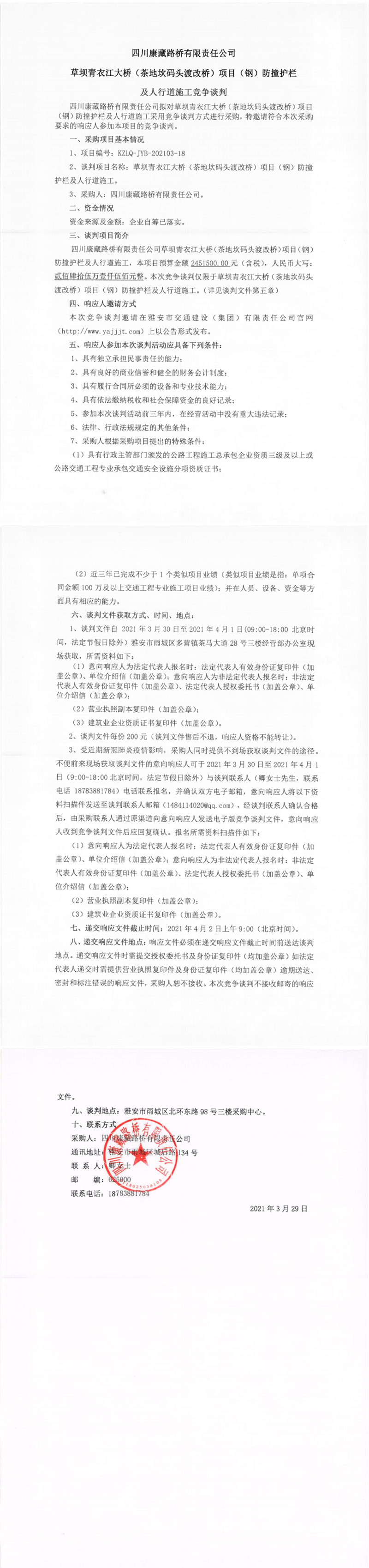 四川康藏路桥有限责任公司草坝青衣江大桥(茶地坎码头渡改桥)项目(钢)防撞护栏及人行道施工竞争谈判公告