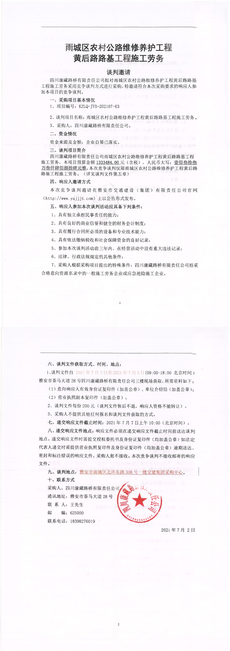 四川康藏路桥有限责任公司雨城区农村维修养护工程黄后路路基工程施工劳务竞争谈判公告