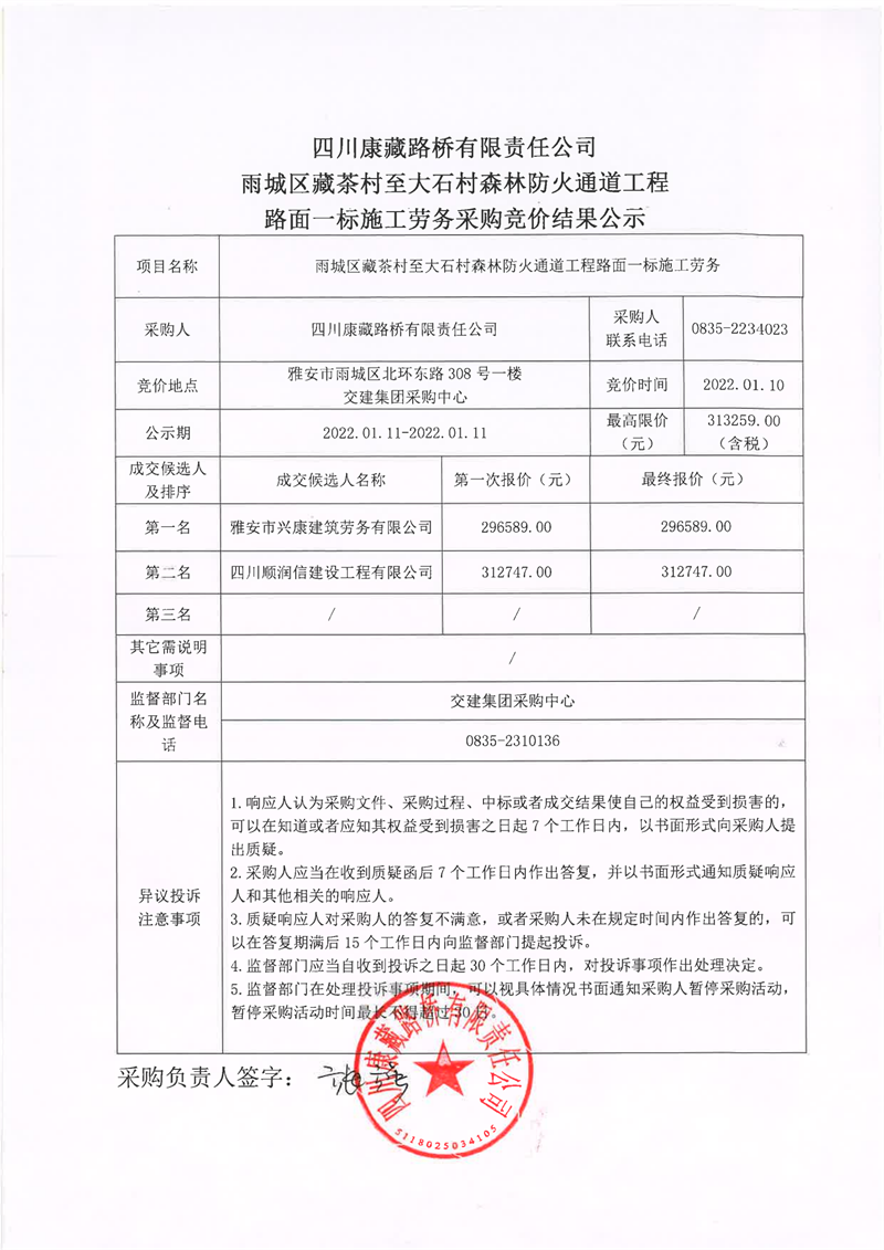 四川康藏路桥有限责任公司雨城区藏茶村至大石村森林防火通道工程路面一标施工劳务采购竞价结果公示
