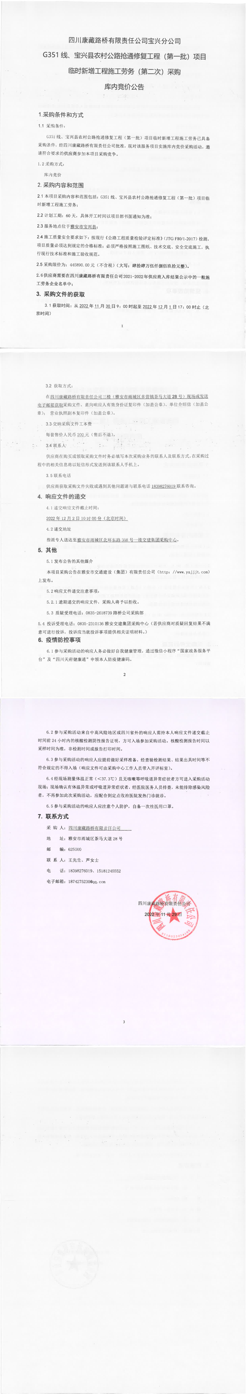 四川康藏路桥有限责任公司G351线、宝兴县农村公路抢通修复工程(第一批)项目临时新增工程施工劳务(第二次)采购库内竞价公告