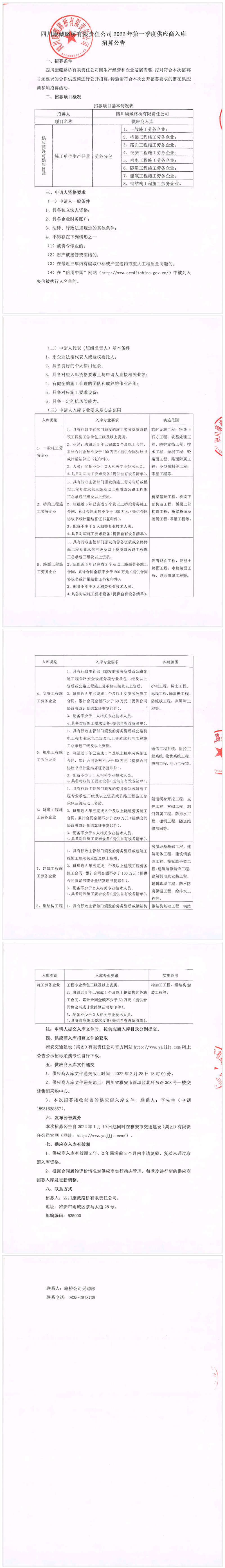 四川康藏路桥有限责任公司2022年第一季度供应商入库招募公告