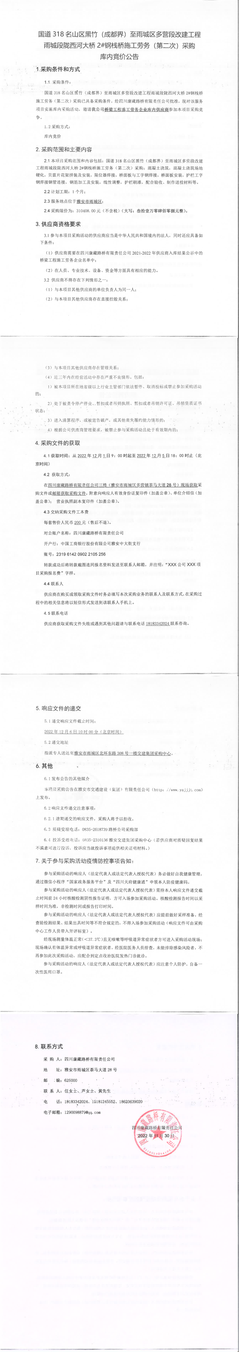 四川康藏路桥有限责任公司国道318名山区黑竹(成都界)至雨城区多营段改建工程雨城段陇西河大桥2#钢栈桥施工劳务(第二次)采购库内竞价公告