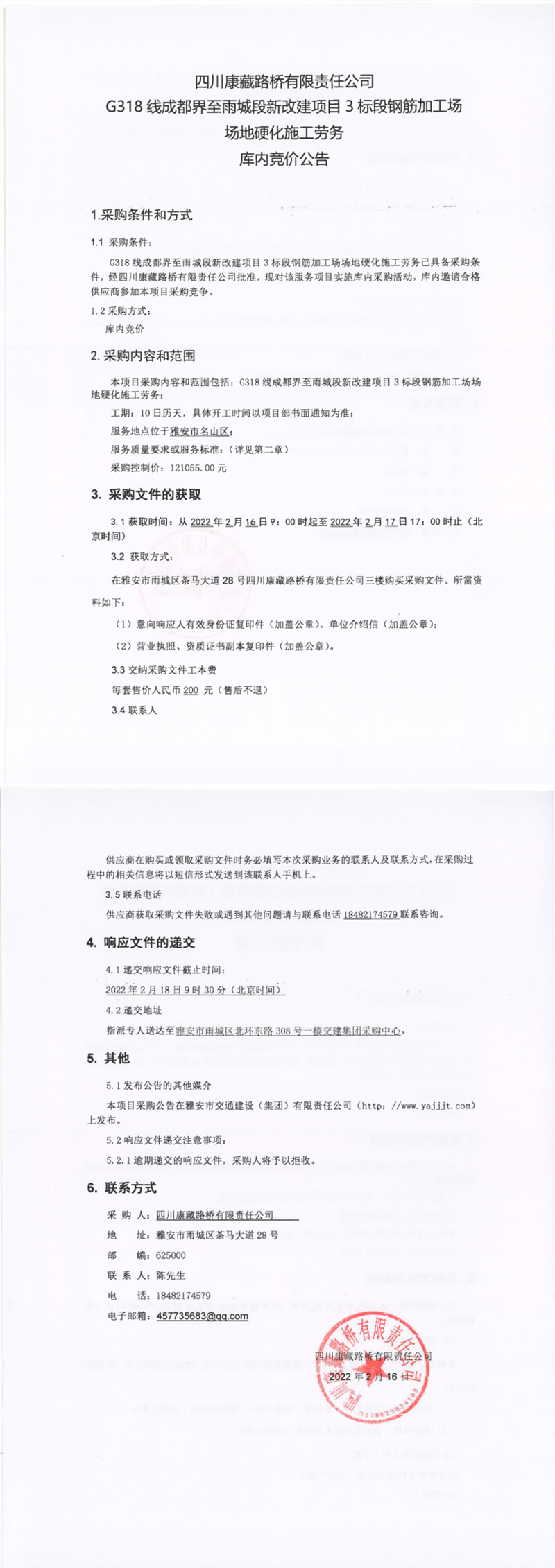 四川康藏路桥有限责任公司G318线成都界至雨城段新改建项目3标段钢筋加工场场地硬化施工劳务库内竞价公告