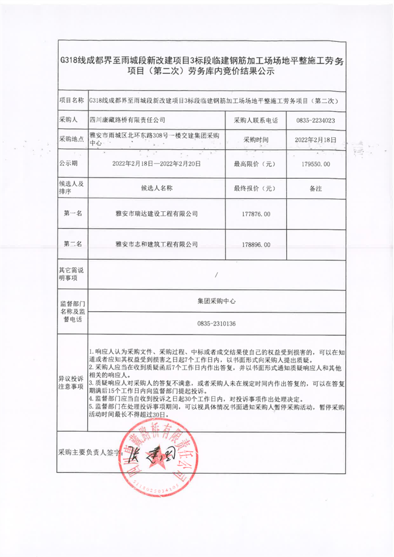 四川康藏路桥有限责任公司G318线成都界至雨城段新改建项目3标段钢筋加工场场地硬化施工劳务库内竞价结果公示