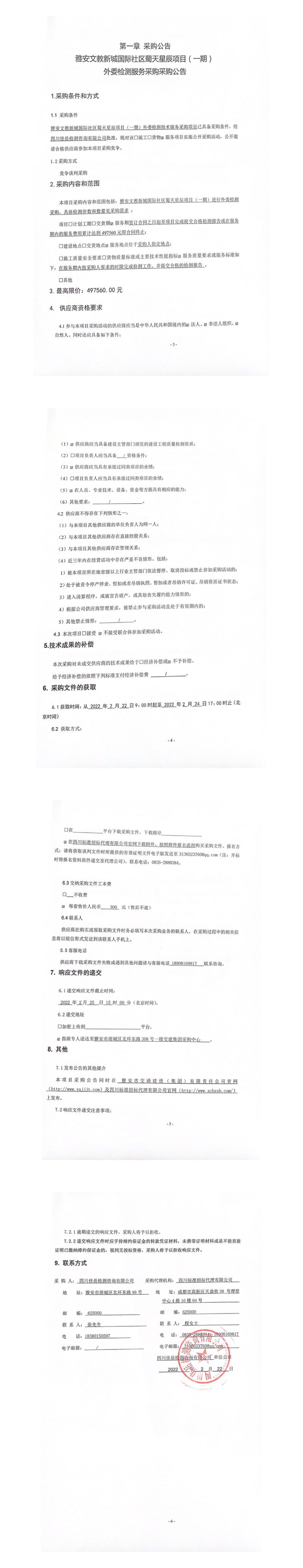 四川佳岳检测咨询有限公司雅安文教新城国际社区蜀天星辰项目(一期)外委检测服务采购采购公告