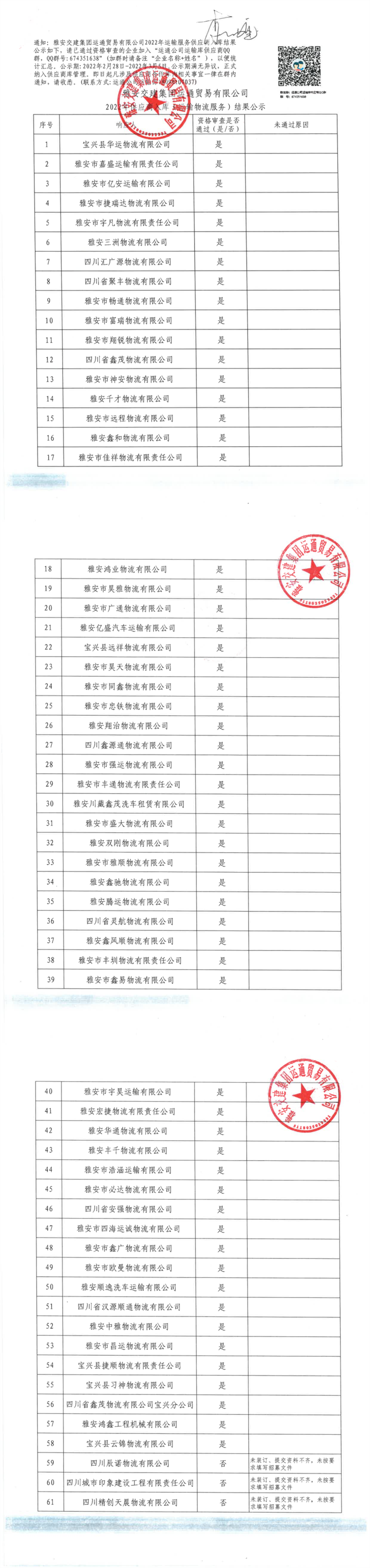 威廉希尔集团运通贸易有限公司2022年供应商入库(运输物流服务)结果公示