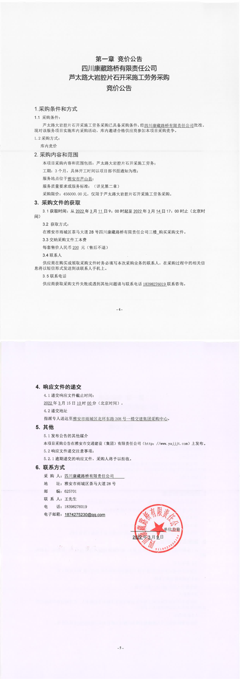 四川康藏路桥有限责任公司芦太路大岩腔片石开采施工劳务采购竞价公告