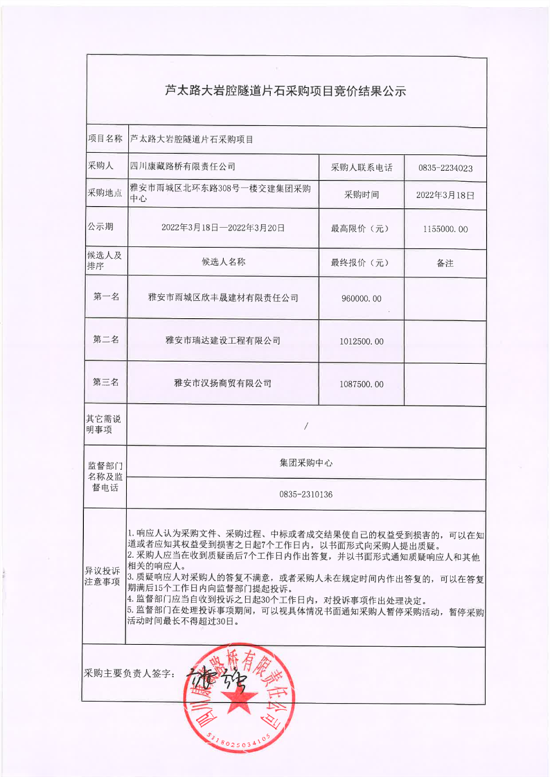 四川康藏路桥有限责任公司芦太路大岩腔隧道片石采购项目竞价结果公示