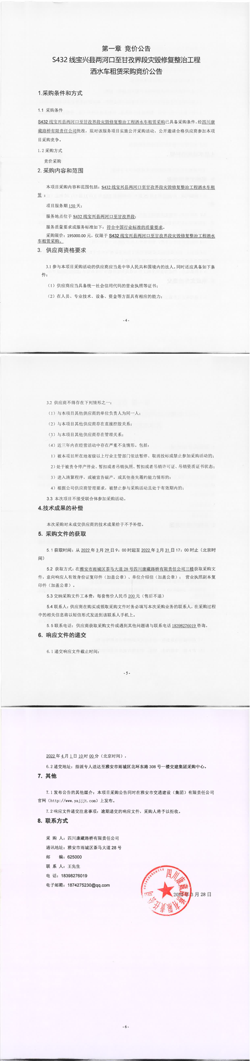 四川康藏路桥有限责任公司S432线宝兴县两河口至甘孜界段灾毁修复整治工程洒水车租赁采购竞价公告