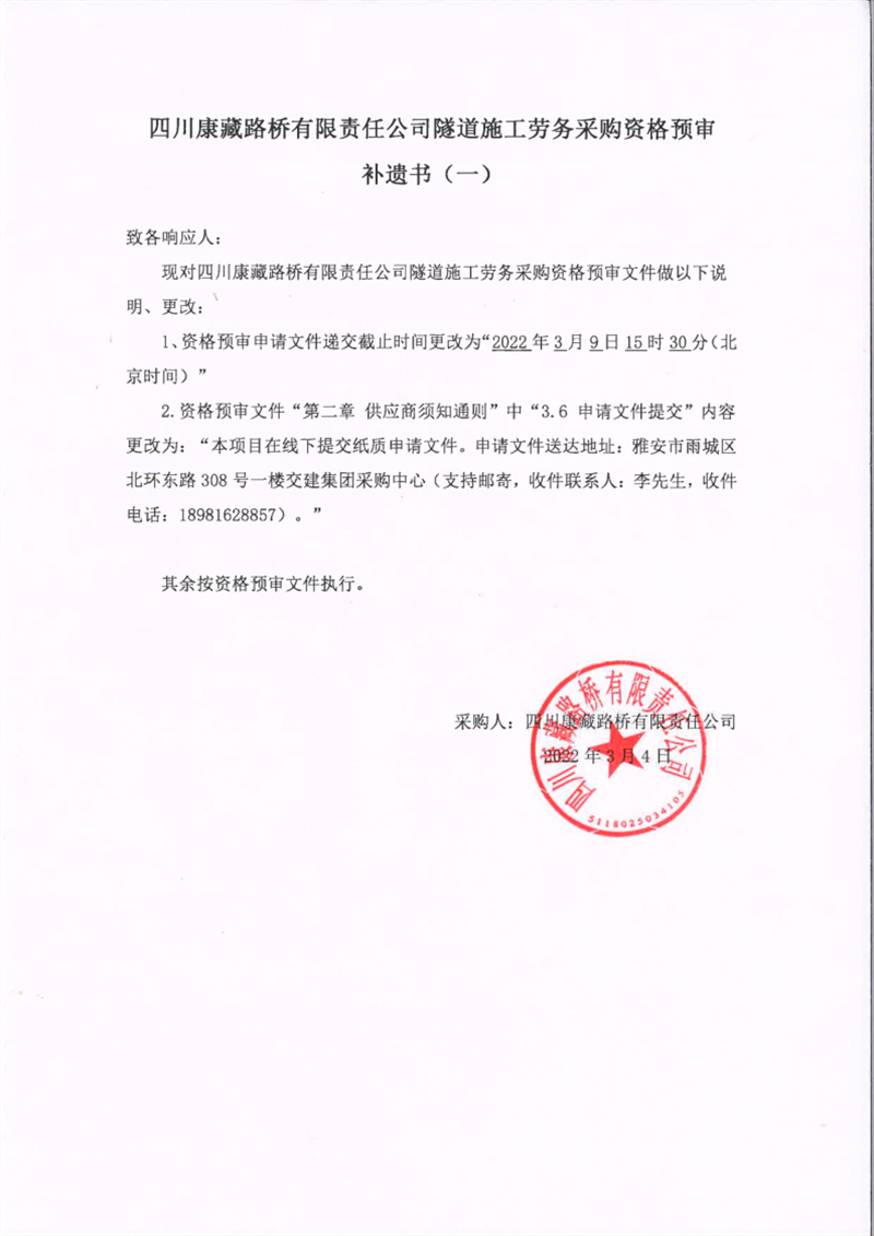 四川康藏路桥有限责任公司隧道施工劳务采购资格预审补遗书(一)