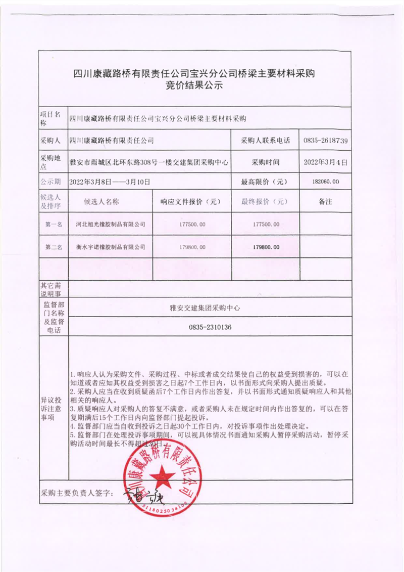四川康藏路桥有限责任公司宝兴分公司桥梁主要材料采购竞价结果公示