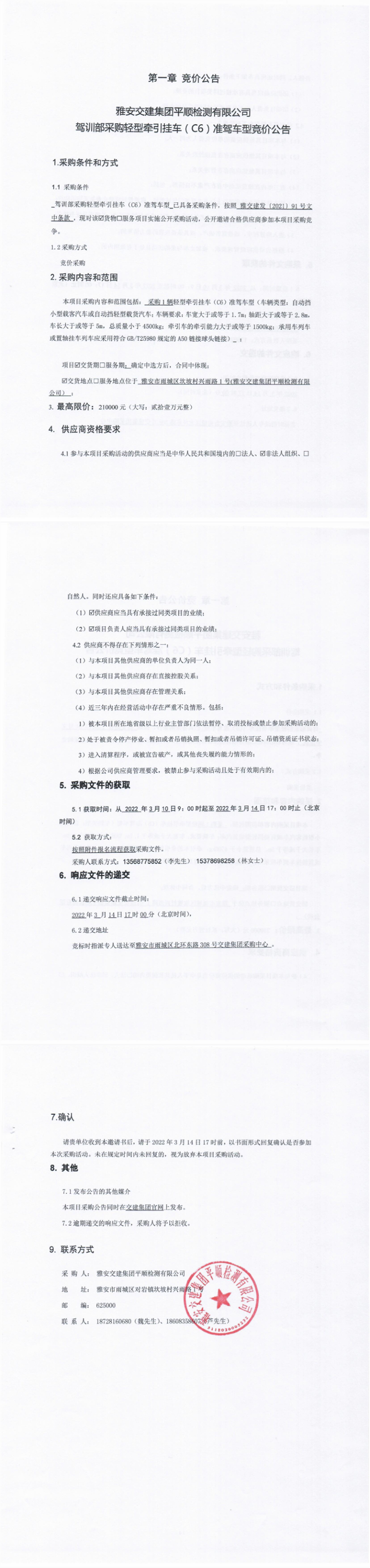 威廉希尔集团平顺检测有限公司驾训部采购轻型牵引挂车(C6)准驾车型竞价公告