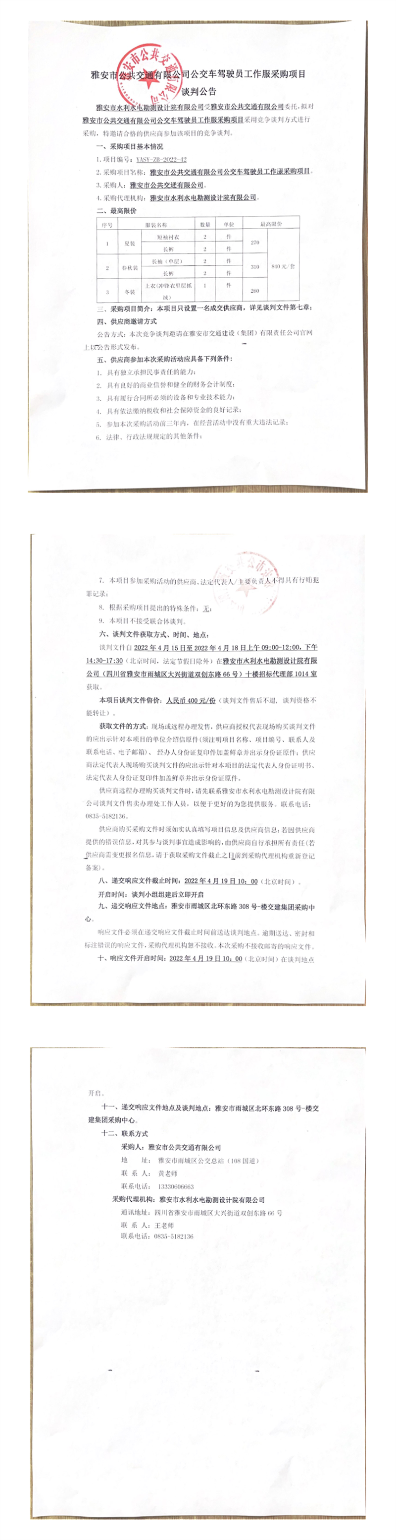 雅安市公共交通有限公司公交车驾驶员工作服采购项目谈判公告