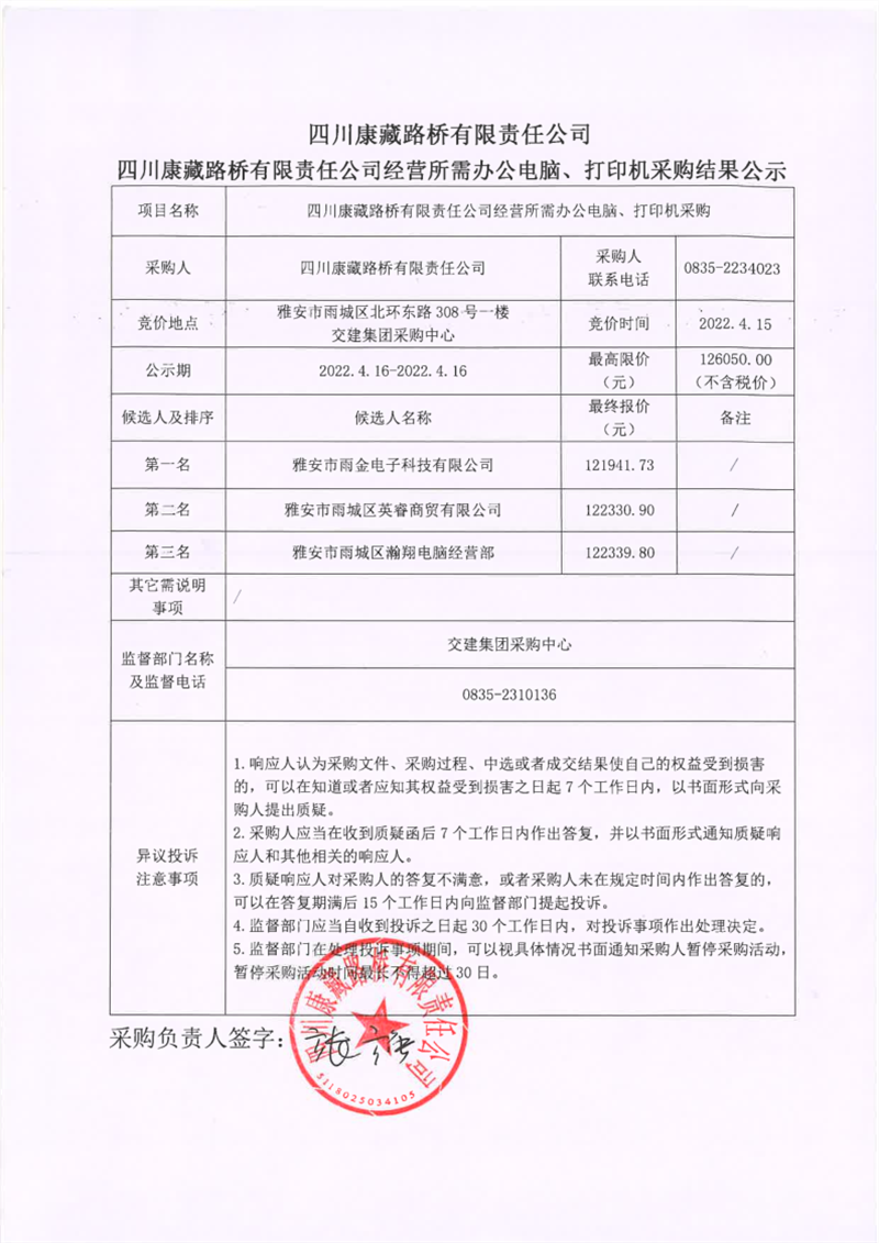 四川康藏路桥有限责任公司经营所需办公电脑、打印机采购结果公示