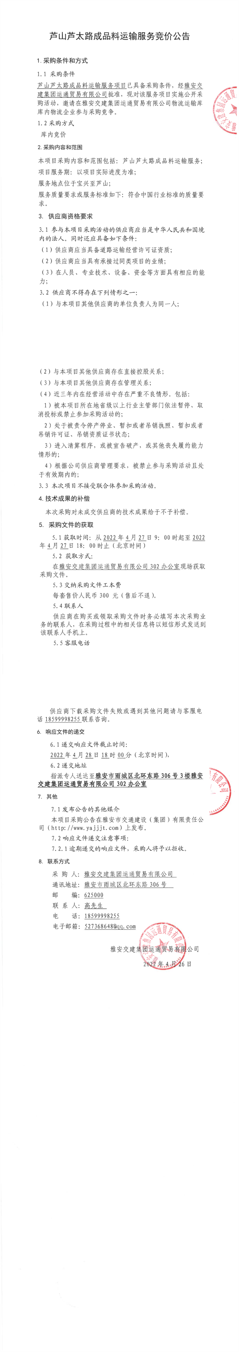 威廉希尔集团运通贸易有限公司芦山芦太路成品料运输服务竞价公告