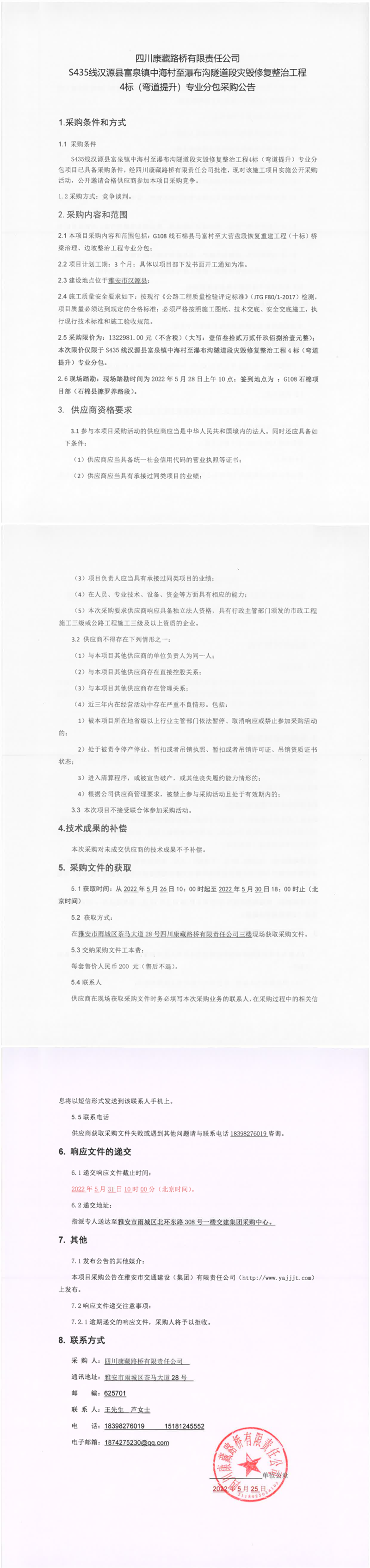 四川康藏路桥有限责任公司S435线汉源县富泉镇中海村至瀑布沟隧道段灾毁修复整治工程4标(弯道提升)专业分包采购公告