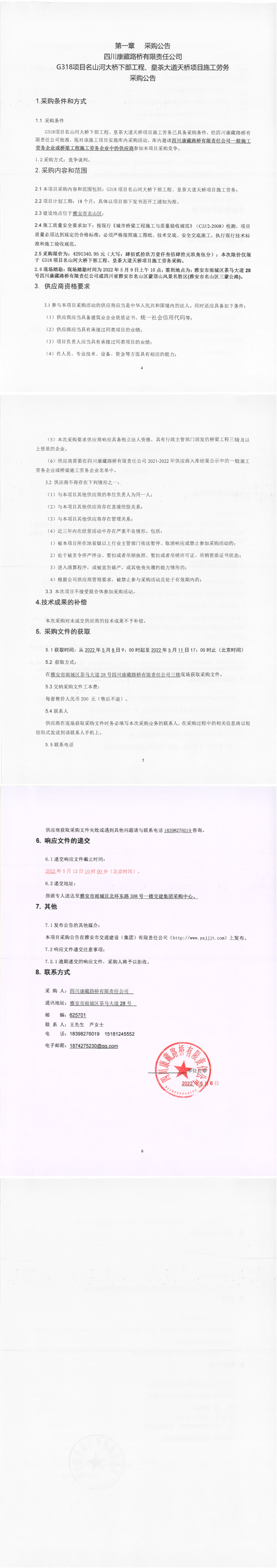 四川康藏路桥有限责任公司G318项目名山河大桥下部工程、皇茶大道天桥项目施工劳务采购公告