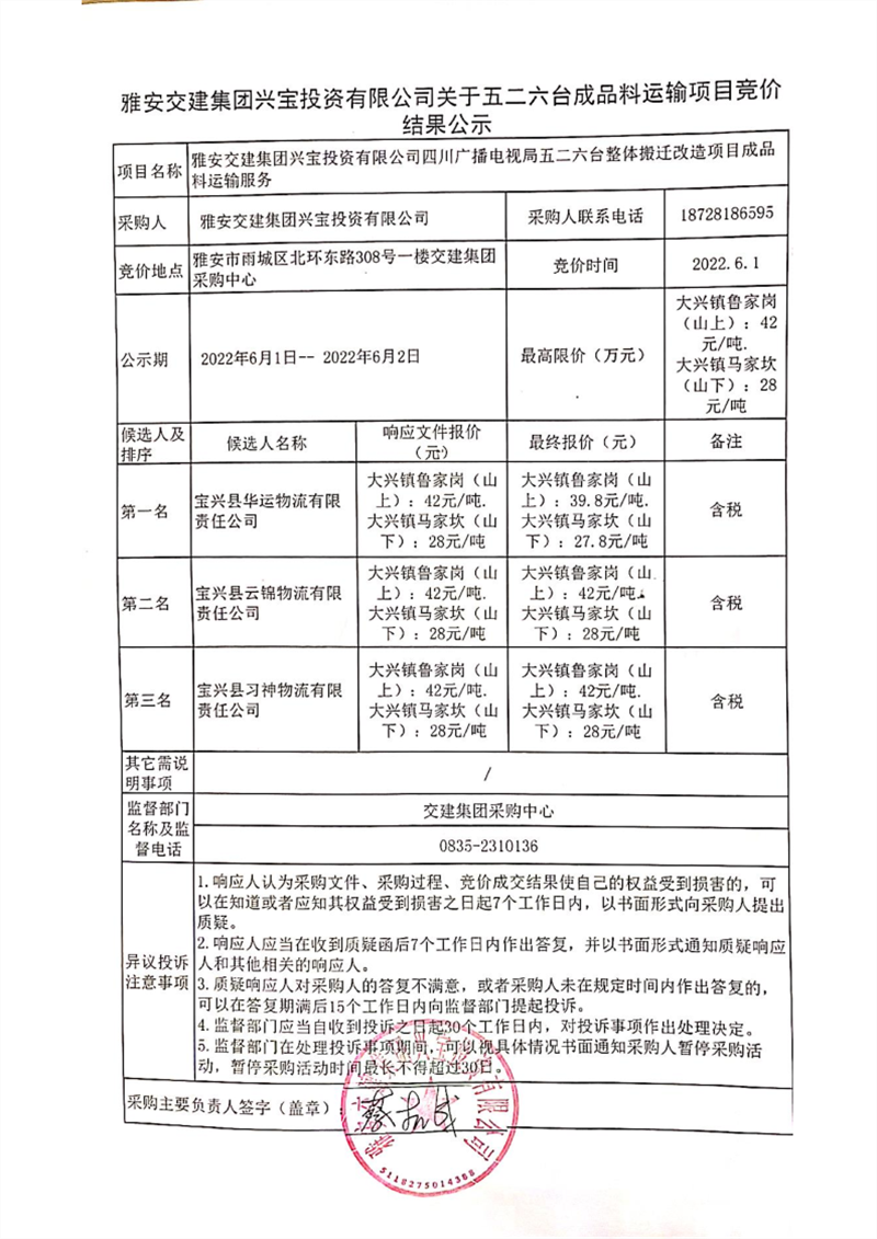 威廉希尔集团兴宝投资有限公司关于五二六台成品料运输项目竞价结果公示